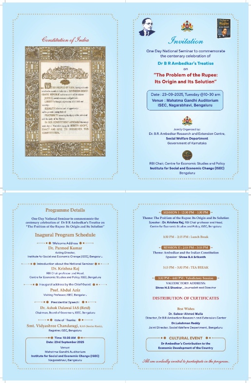 RBI Chair, Centre for Economic Studies and Policy, ISEC, in association with Dr B R Ambedkar Research Institute, Social Welfare Department, Government of Karnataka, has organised a one-day national seminar on “The Problem of the Rupee: Its Origin and Its Solution” authored by Dr B R Ambedkar, on Tuesday, 23rd September, 2025, at 10 AM, in Mahatma Gandhi Auditorium, ISEC, Bengaluru. Dr B R Ambedkar is well known as constitutional expert but hardly known as he was a renowned economist. Dr Ambedkar obtained Ph D in Economics from Columbia University, New York, USA and DSc from London School of Economics, UK. B.R. Ambedkar had extensively written on several economic topics and his magnum opus include “Administration and Finance of the East India Company” (1915), “The Problem of the Rupee: Its Origin and Its Solution” (1923),